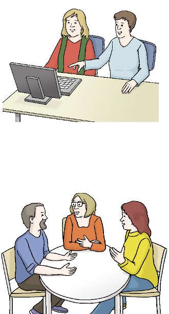 In einem Gespräch unterhalten sich die Mitarbeiter.